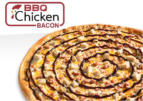 A creamy white garlic sauce base, sprinkled with fresh mozzarella and cheddar cheeses, grilled chicken breast, smoky bacon, and topped with a tangy BBQ sauce swirl