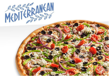 A zesty tomato sauce base, topped with fresh mozzarella, green peppers, red onions, grape tomatoes, black olives, and sprinkled with feta