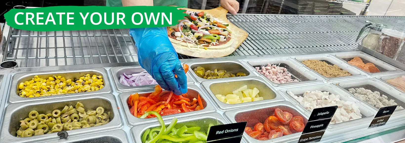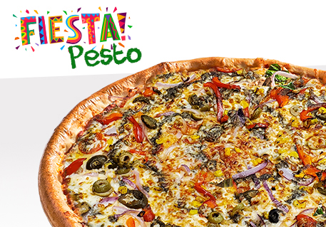 Zesty Tomato Sauce, Mozzarella Cheese, Onion, Red Pepper, Corn, Jalapeno, Green Olive, Pesto Drizzle
