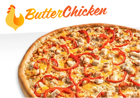 A creamy white garlic sauce base, topped with fresh mozzarella and cheddar cheeses, grilled chicken breast, red peppers and finished with a authentic butter chicken sauce drizzle