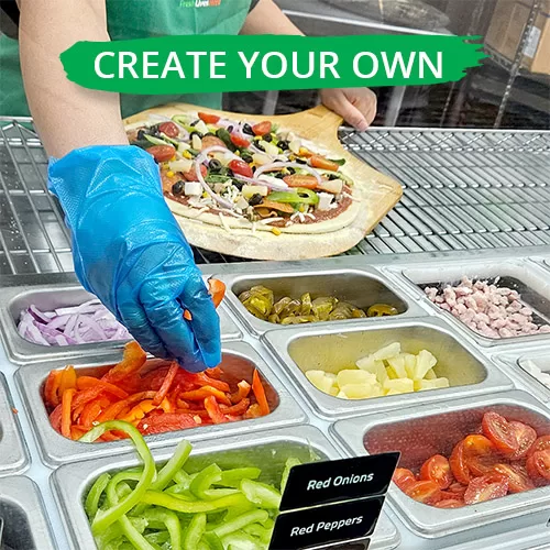A zesty tomato sauce base, sprinkled with fresh mozzarella, then loaded with leafy spinach, red onions, mushrooms, grape tomatoes, and red peppers